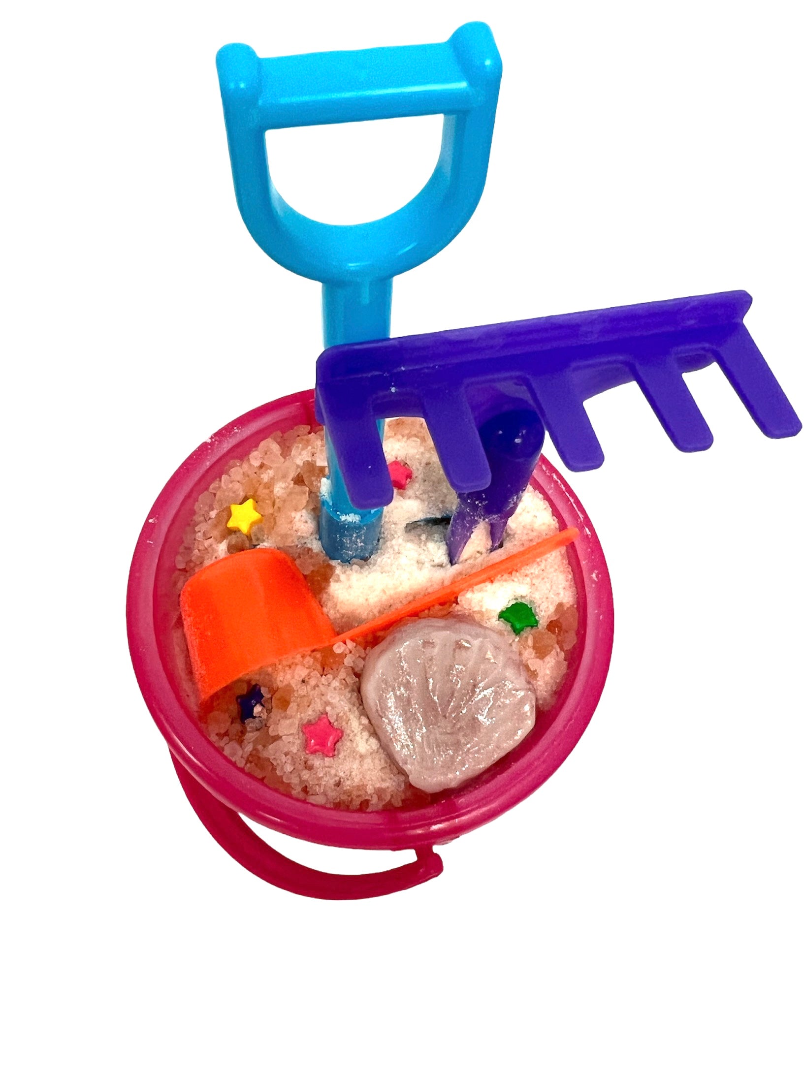 Kids love these adorable mini beach pails! They come with a shovel, rake and scoop so you can play with the bath bomb mixture inside.